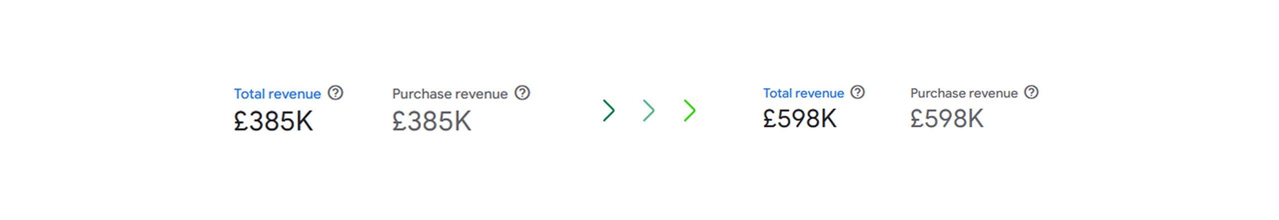 A £213K increase in total and purchase revenue, rising from £385K to £598K, indicating a significant impact from the UX improvements. The increase suggests that better engagement, improved navigation, and a more intuitive user journey have led to higher conversions and purchase values, directly translating into increased revenue.