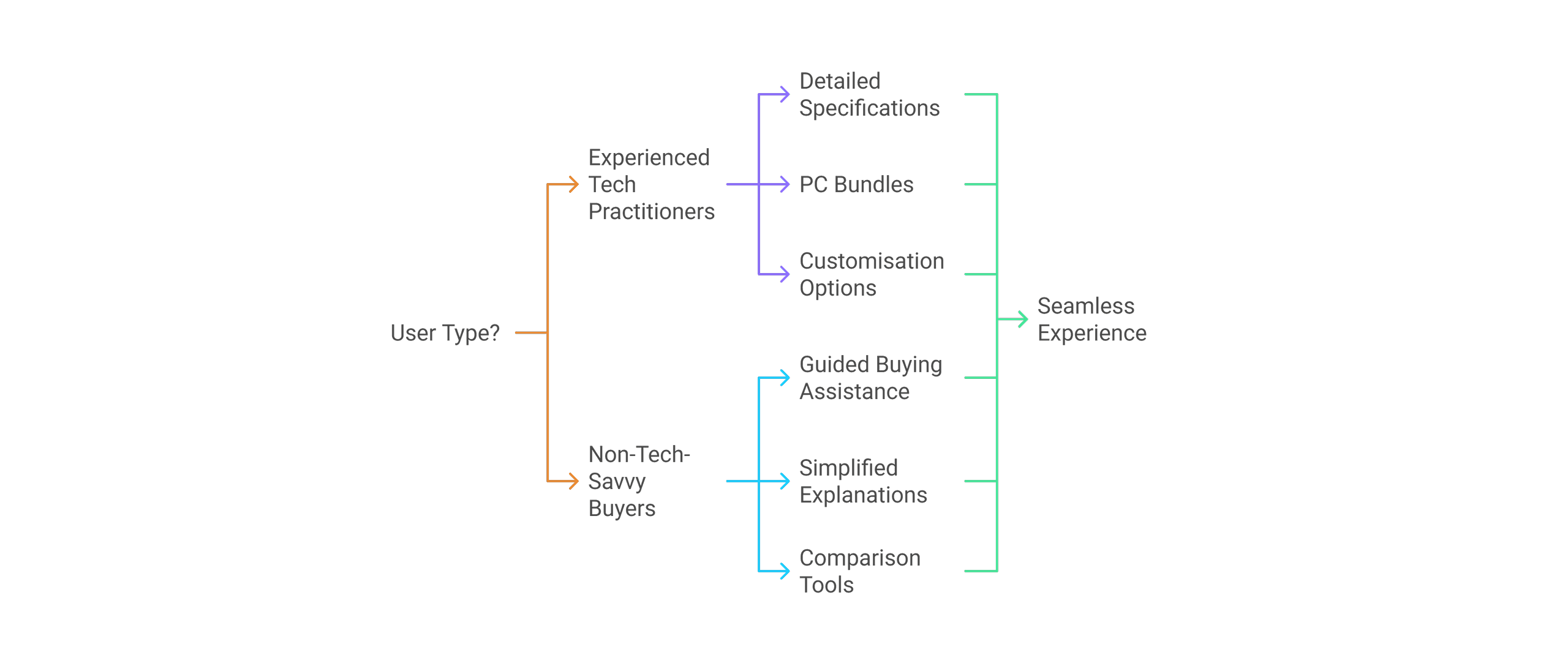 This diagram outlines a UX strategy catering to both Tech Practitioners and Non-Tech-Savvy Buyers. Focusing on detailed specifications, PC bundles, and customisation options ensures an efficient experience for experienced users, while guided buying assistance, simplified explanations, and comparison tools help beginners navigate the purchase process, creating a seamless user journey.