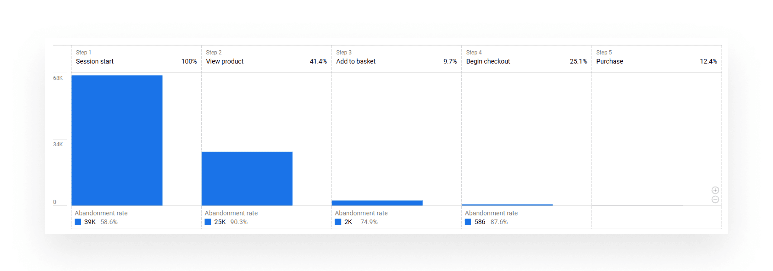 The user purchase journey shows a sharp rise from session start to purchase. However, there's a drop-off from 100% to 41% at the product view stage, with the biggest losses occurring at steps 3 and 4—adding to the basket and starting checkout.